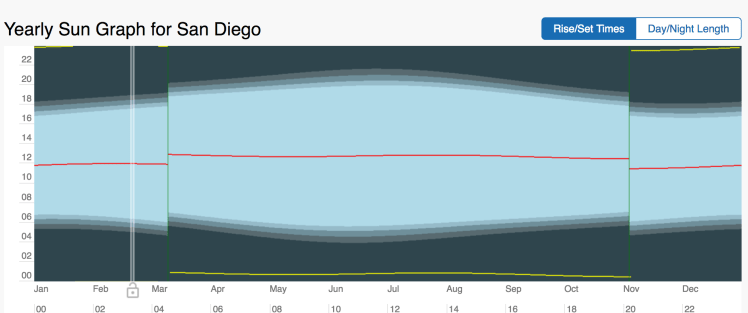 And compare it to a chart showing the same data for San Diego, CA, my current home, where the sun comes up between 3:00 a.m. and 6:00 a.m. (adjusted for daylight savings time) and goes down between 4:00 p.m. and 7:00 p.m. (adjusted for daylight savings time):