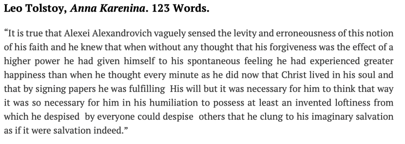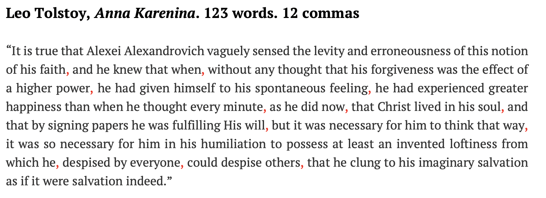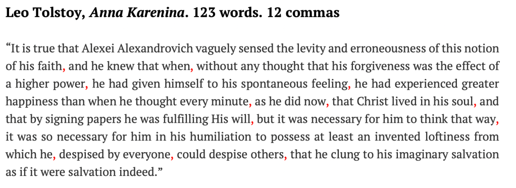 The sentence above, from an English translation of Leo Tolstoy’s Anna Karenina, is 123 words long. The version visible above has none of that version’s commas. Note that the translator of Tolstoy’s work in English did not use parentheses or dashes or semicolons to function as separators in place of commas. The only punctuation marks missing from the piece are commas.