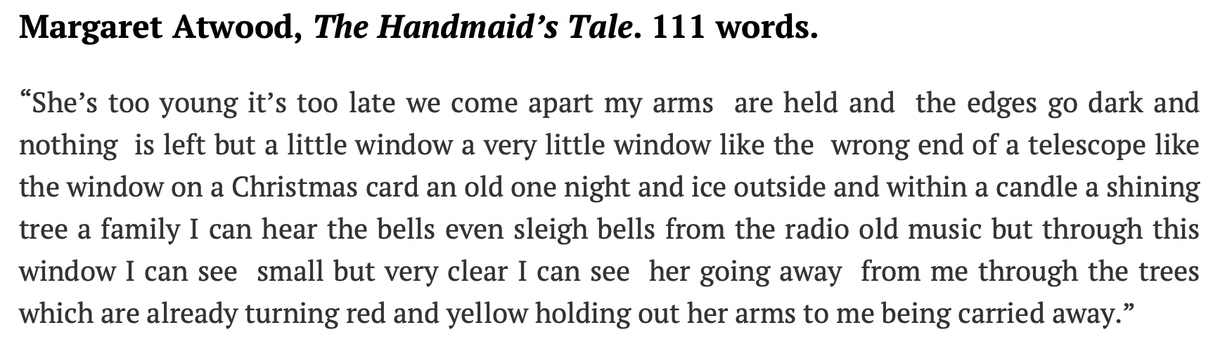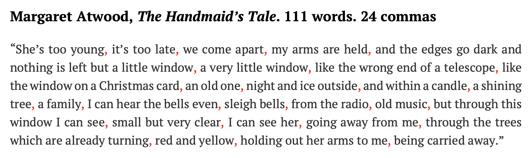 The sentence at the top of this post is one I know was written in English, not translated from a language that may more commonly see long sentences so they end up as long English sentences when translated. It has 111 words with 24 commas, most of which I feel connect rather than separate so that the thoughts in the sentence are held together, to emphasize the staccato beats of emotions the words reflect. This sentence could be a series of much shorter sentences, but I believe the commas make it more powerful as written.